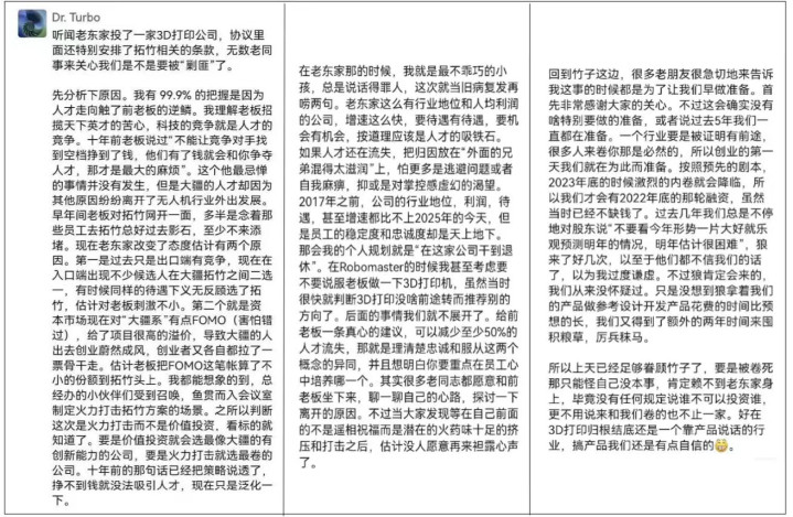 ▲拓竹科技创始人兼CEO陶冶在朋友圈的千字长文,让拓竹跟大疆的「商战大戏」快速出圈。